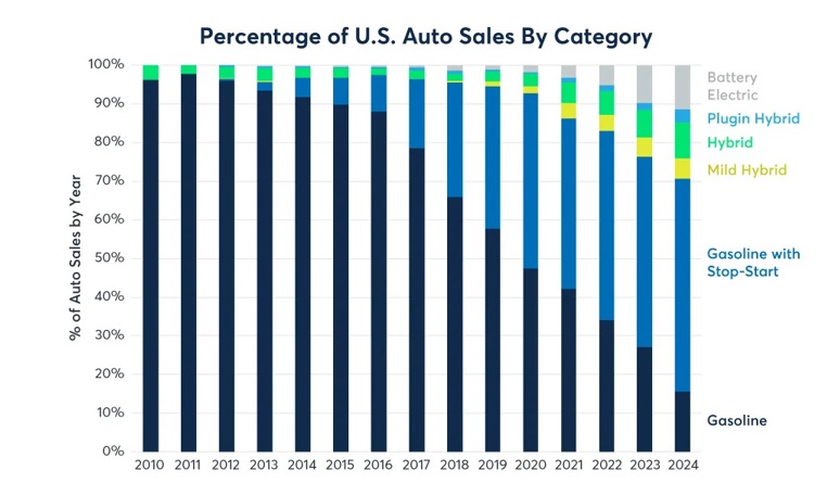Например, в США в 2024 году объемы продаж электромобилей увеличились до 11,4% от общего объема продаж автомобилей, тогда как продажи электромобилей в Китае достигли почти 50% от общего объема продаж автомобилей в том же году.