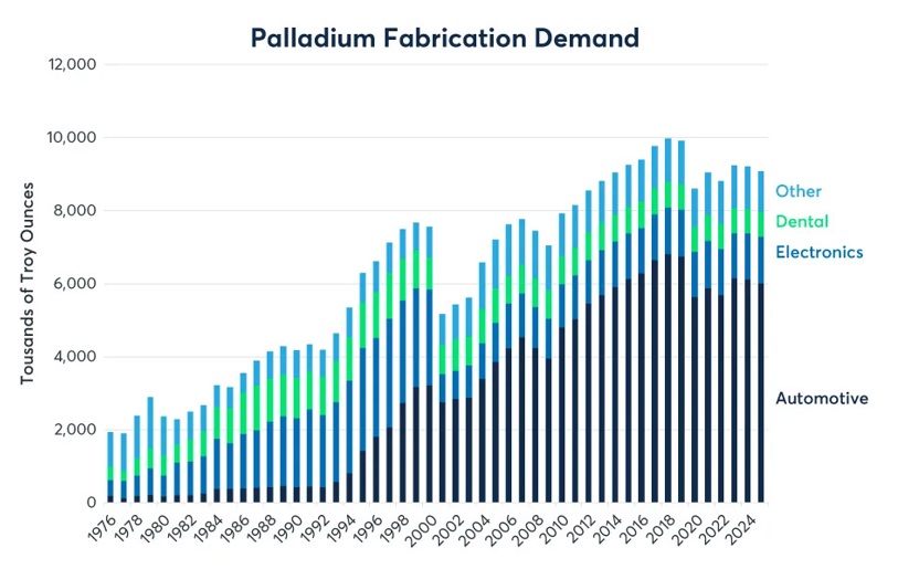 Ожидается, что спрос на палладий в текущем году снизится совокупно на 2%, до 8,78 млн унций, в первую очередь из-за стагнации спроса в автомобильной промышленности, поскольку появляется все больше новых моделей электромобилей. Тенденция последних лет — увеличение доли аккумуляторных электромобилей (BEV).
